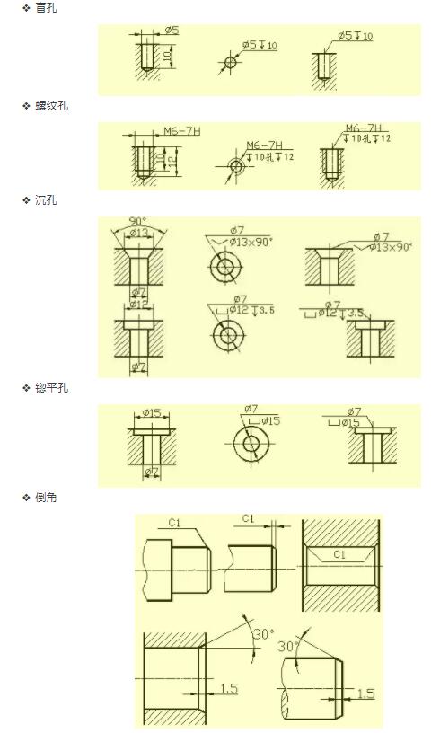 常見孔的尺寸注法(盲孔、螺紋孔、沉孔、锪平孔);倒角的尺寸注法。