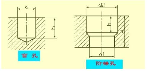 用鉆頭鉆出的盲孔,在底部有一個120°的錐角,鉆孔深度指的是圓柱部分的深度,不包括錐坑。在階梯形鉆孔的過渡處,也存在錐角120°圓臺,其畫法及尺寸注法。