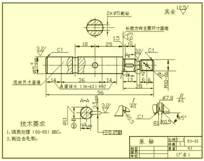 如圖中所示的表面粗糙度為Ra6.3的右軸肩,被選為長度方向的主要尺寸基準,由此注出13、28、1.5和26.5等尺寸;再以右軸端為長度方向的輔助基,從而標注出軸的總長96。