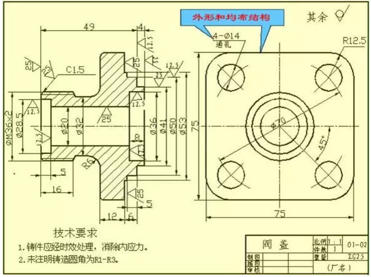 這類零件的基本形狀是扁平的盤狀,一般有端蓋、閥蓋、齒輪等零件,它們的主要結構大體上有回轉體,通常還帶有各種形狀的凸緣、均布的圓孔和肋等局部結構。在視圖選擇時,一般選擇過對稱面或回轉軸線的剖視圖作主視圖,同時還需增加適當?shù)钠渌晥D(如左視圖、右視圖或俯視圖)把零件的外形和均布結構表達出來。如圖中所示就增加了一個左視圖,以表達帶圓角的方形凸緣和四個均布的通孔。
