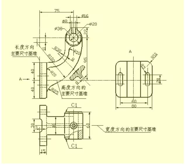 在標注叉架類零件的尺寸時,通常選用安裝基面或零件的對稱面作為尺寸基準。尺寸標注方法參見圖。