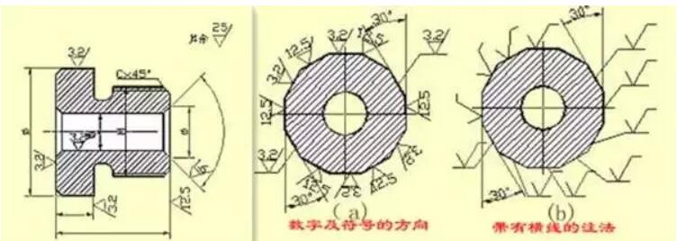 2)表面粗糙度代號中數(shù)字及符號的方向必須按規(guī)定標注。