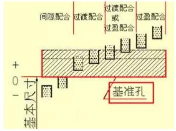 基孔制--是指基本偏差為一定的孔的公差帶與不同基本偏差的軸的公差帶形成各種配合的一種制度。見左下圖。基孔制的孔稱為基準孔,其基本偏差代號為H,其下偏差為零。