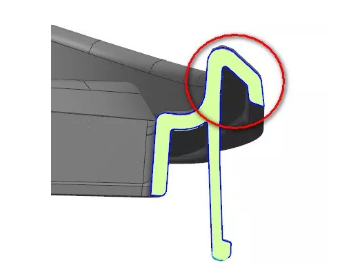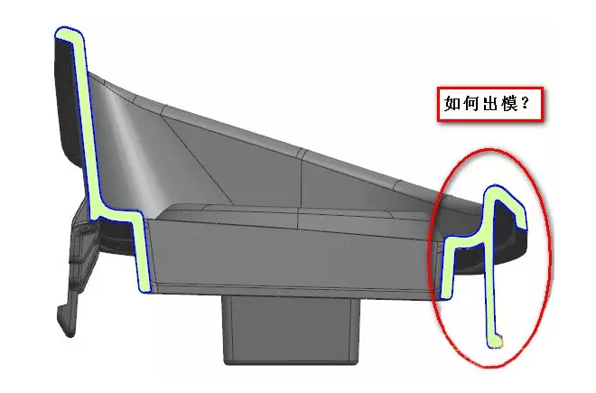 做普通滑塊機(jī)構(gòu)抽出,紅色框的鋼料卡住無法出模,必須線將紅色框的鋼料先脫離產(chǎn)品再抽離倒扣。