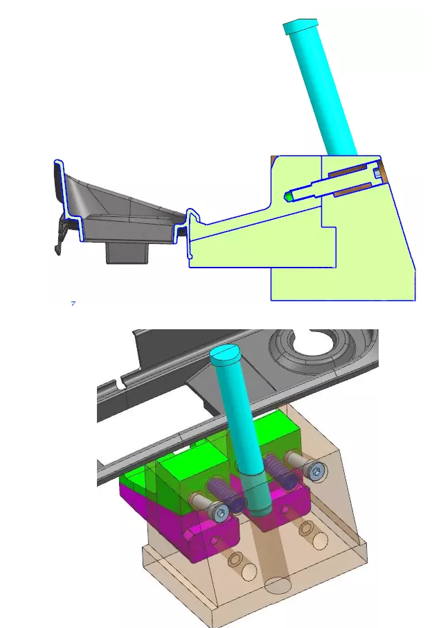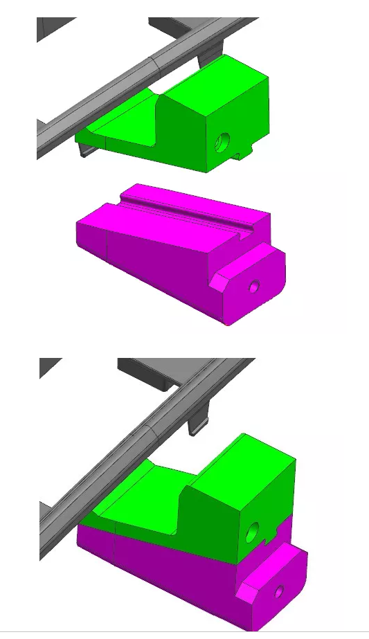 綠色為斜頂,帶突出的燕尾,品紅色為滑塊,主要是抽出倒扣和驅(qū)動(dòng)斜頂向下脫扣,燕尾槽滑配。