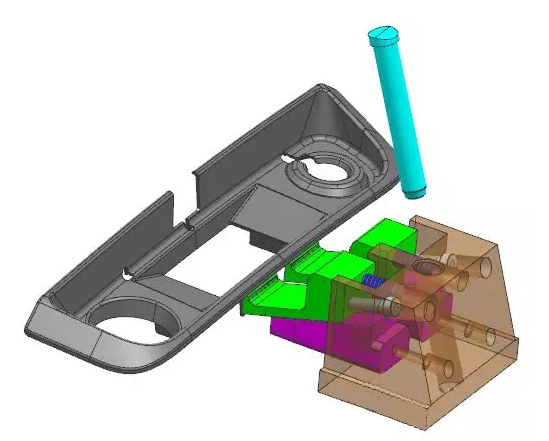 斜導(dǎo)柱驅(qū)動(dòng)滑塊向右側(cè)抽芯,品紅色的滑塊鑲件驅(qū)動(dòng)斜頂向下運(yùn)動(dòng),同時(shí)脫離倒扣,彈簧防止斜頂跟著滑塊往右邊走,走到一定距離以后限位螺絲限死,斜頂同時(shí)跟著滑塊抽芯。