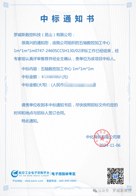 在參與的上海航空發(fā)動(dòng)機(jī)復(fù)合材料有限責(zé)任公司招標(biāo)項(xiàng)目中,成功中標(biāo)五軸數(shù)控加工中心項(xiàng)目。